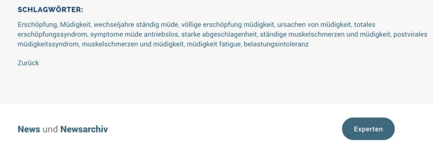 Bei jedem Artikel unten gibt es SCHLAGWÖRTER: Keyword 1, Keyword 2, …, siehe Vorschau-pdf des phantastischen Traffic-Booster SEO Systems in TYPO3: diese Keywords sind einzelne Links in Google, d.h. ein kurzer Artikel z.B. zu Burnout, ATP, Müdigkeit plus 10 Schlagwörter / Keywords zum jeweiligen Thema = 11 Treffer in Google, das ist das enorm große Potential des Medizinportals, wenn Sie 100 Artikel z.B. in einem Glossar von A-Z einbauen x 10 Keywords, haben Sie 1.100 Treffer in Google und entsprechend hohe dauerhafte monatliche Zugriffe :-)